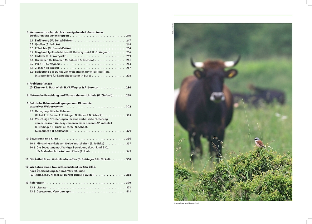 Andere Kapitel beschäftigen sich mit weiteren naturschutzfachlich wertgebenden Habitaten und Artengruppen wie Quellen, Röhrichten, Kadavern, Orchideen, Zikaden und Dung sowie mit „Problempflanzen“. Politischer Rahmen und Ökonomie von naturnahen Weiden, Beziehungen zur EU-Wasserrahmenrichtlinie sowie Klimawirksamkeit und Ästhetik von Weidelandschaften werden zusätzlich thematisiert.